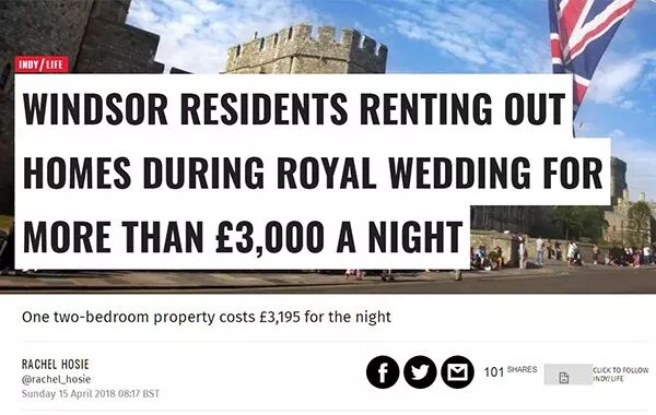而且在这次婚礼的举办地温莎小镇,民众更是把“近水楼台先得月”给发挥到了极致,很多居民都把自家屋子出租给了游客和媒体(有的甚至是自己搬出去给租客腾地方)。这种盛况简直比第一位平民王妃——凯特王妃的婚礼都有过之而无不及。