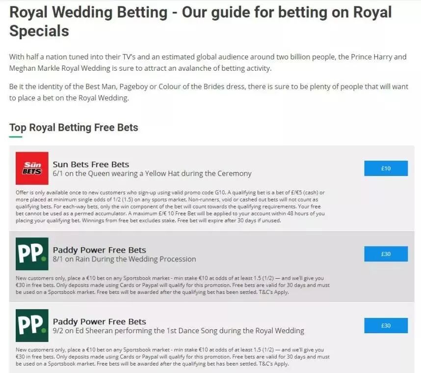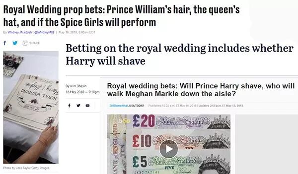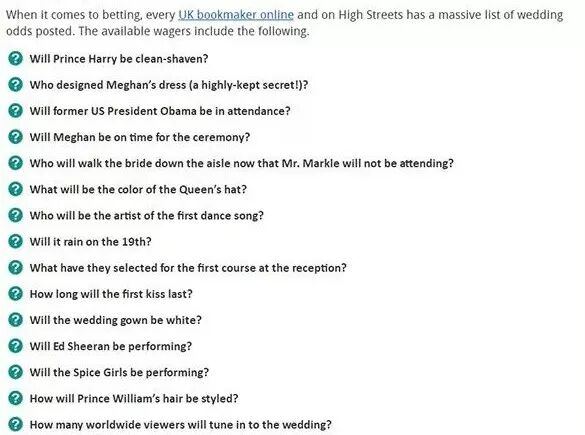 甚至全民都在下注打赌,投注内容包括婚纱将由谁设计,伴郎伴娘的人选,谁会领着梅根走向哈里,女王会借给梅根哪顶王冠,哈里王子的单身派对地点,以及他结婚时会不会刮胡子等等。凡是能跟婚礼沾边的他们都赌,这真的是很英国了。