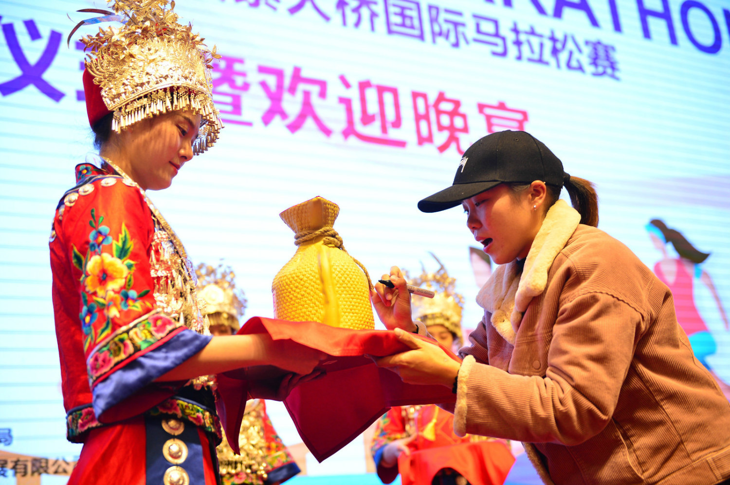 在颁奖庆典上,获奖运动员还得到了冠名商酒鬼酒公司赠送的享誉世界的湘西品牌内参酒和酒鬼酒。本次全马冠军黄世昌和邓超群共同为酒鬼酒签名留念。