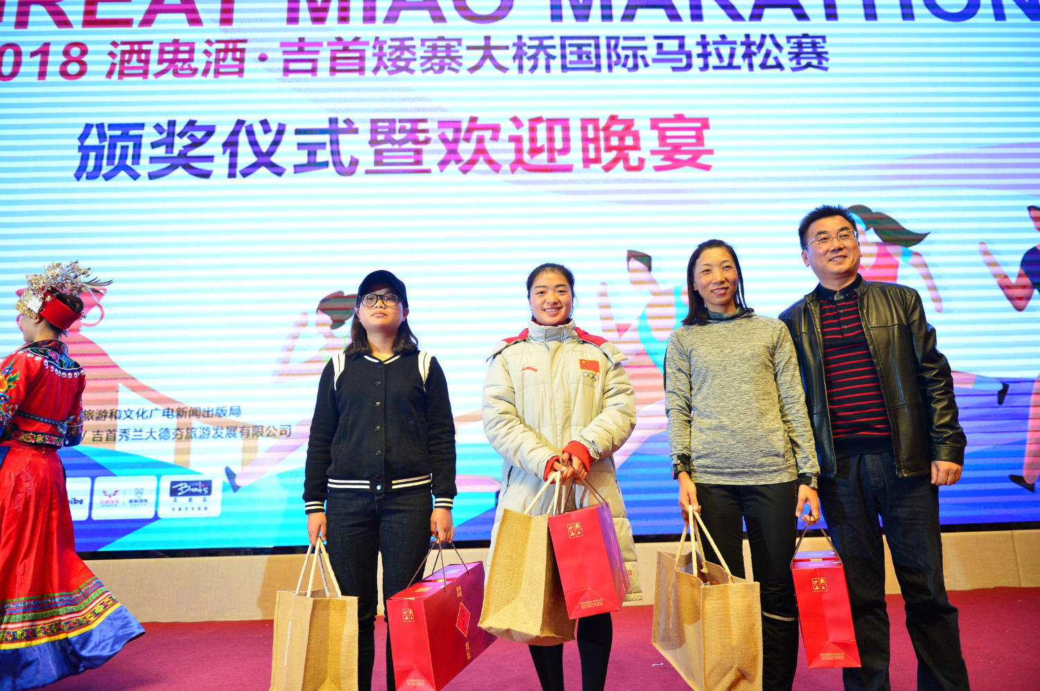 图:国际路跑协会官员丹尼斯、吉首市德夯风景名胜区管理处主任吴勇,感谢赞助商酒鬼酒的大力支持