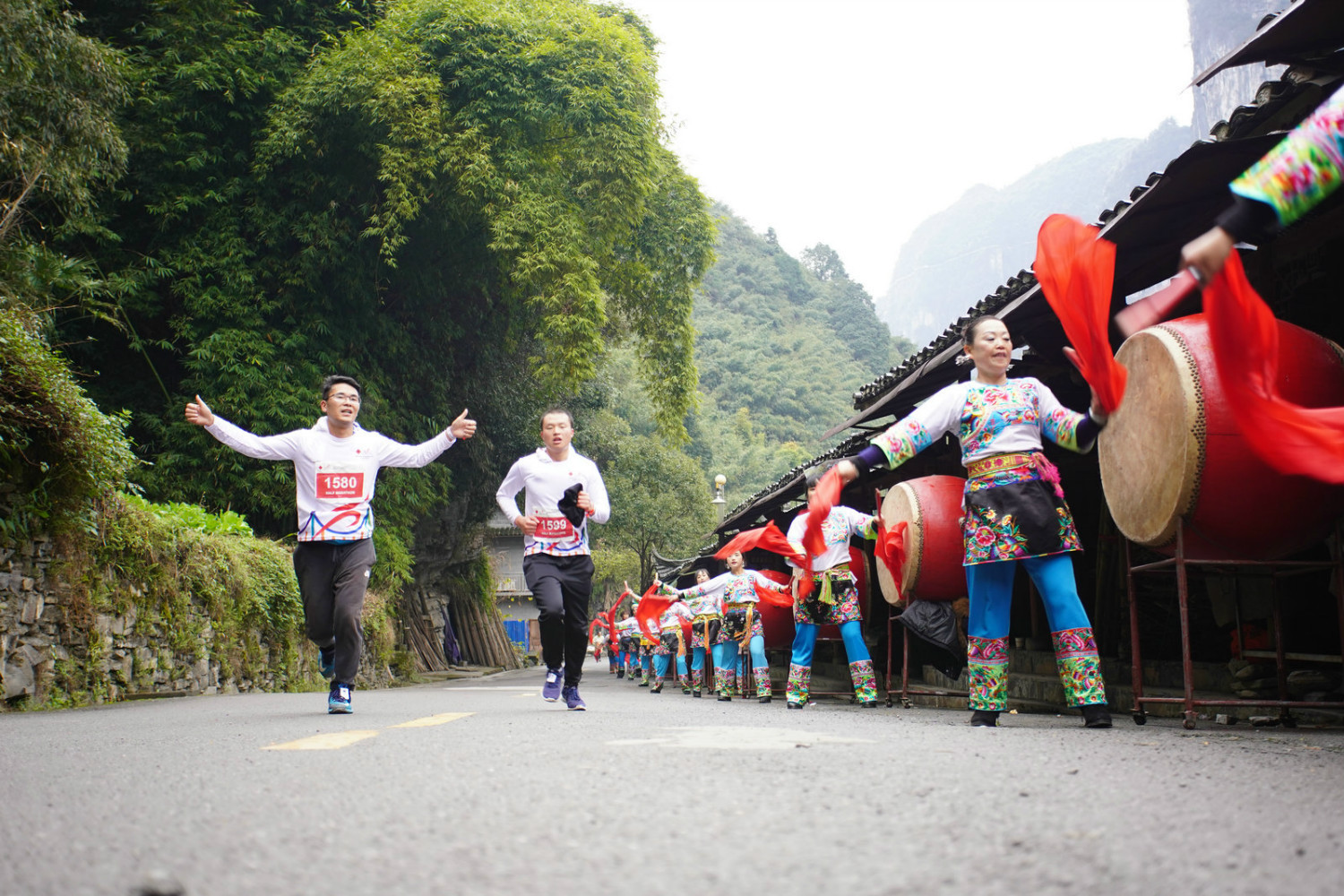 2018酒鬼酒.矮寨大桥国际马拉松赛道途经苗族风情村寨、蜿蜒的盘山公路、沿河观光绿道及德夯大峡谷等不同地貌和景观,“苗族歌舞之乡”,“天下鼓乡”给参赛者带来了非比寻常的奇妙体验。