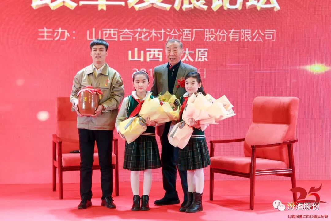 汾酒酒都学校的两位小朋友向郭裕怀先生献上了鲜花,汾酒生产一线的优秀酒工辛达明向老先生献上了一坛66度头锅原浆汾酒,代表汾酒最真的品质和汾酒人最真的感情,酒坛上还铭刻着“敬赠郭裕怀先生,汾酒永远感恩您”,表达了汾酒对郭裕怀先生的感激之情。更表达了以郭裕怀为代表的,为汾酒上市做出贡献的省级领导、各厅局领导,感恩为汾酒上市做了大量工作的相关机构,以及参与上市工作的汾酒厂内部干部职工。感谢25年来,一直关心、支持汾酒工作的社会各界人士。
