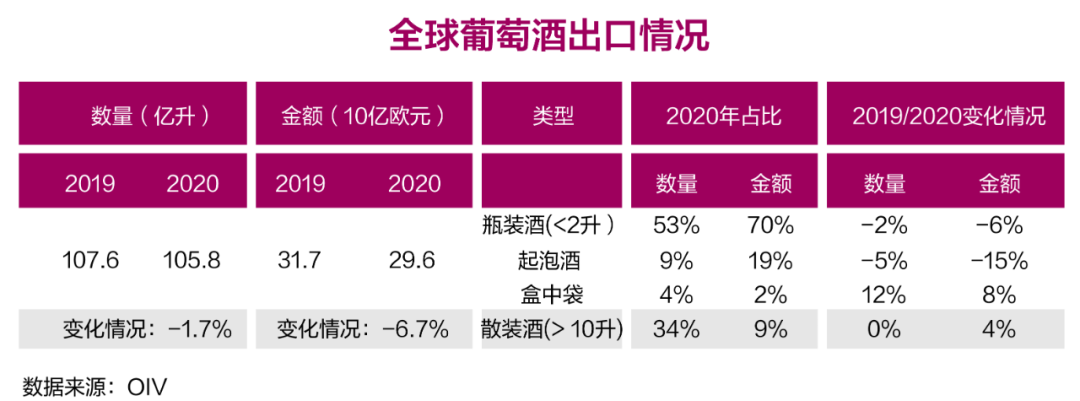 在深受疫情困扰的2020年,全球葡萄酒出口总量略有萎缩,达到105.8亿升,较2019年下降1.7%,出口额下降6.7%,为296亿欧元。
