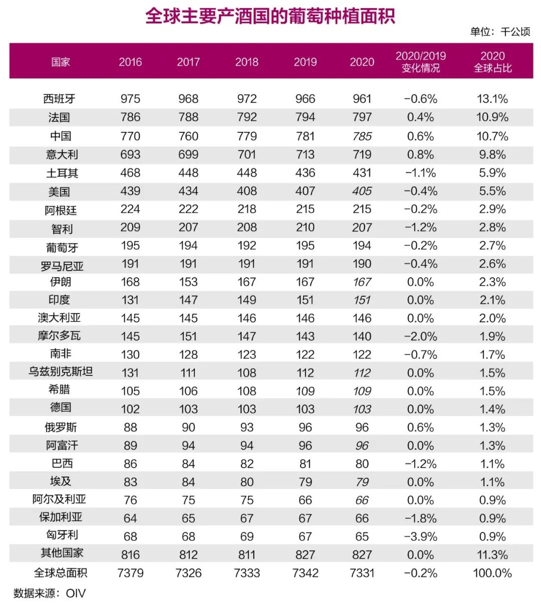 2020年全球葡萄种植面积(包括葡萄酒、果汁、鲜食葡萄和葡萄干各类用途,以及尚未投入生产的葡萄树)预估数据为730万公顷。虽然这一数字自2017年以来似乎一直稳定,但各国情况千差万别。